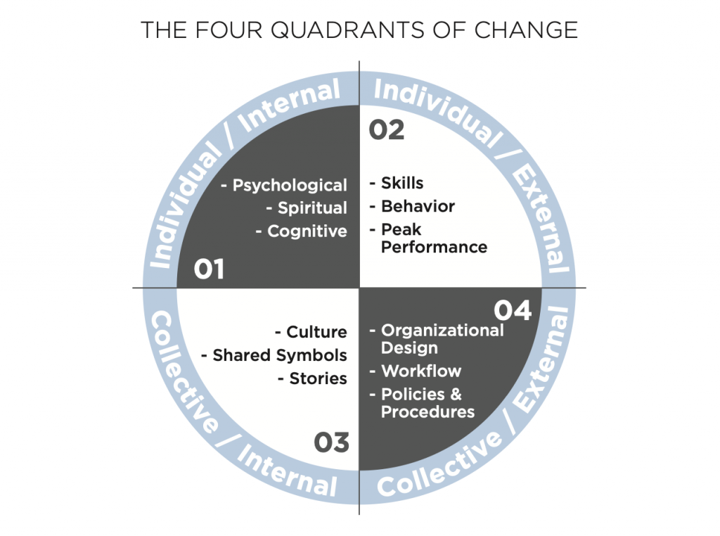 Normalmente las organizaciones hacen foco en lo externo individual y colectivo, cuadrantes 2 y 4: Metodologías, conocimientos técnicos, procedimientos, organización empresarial…