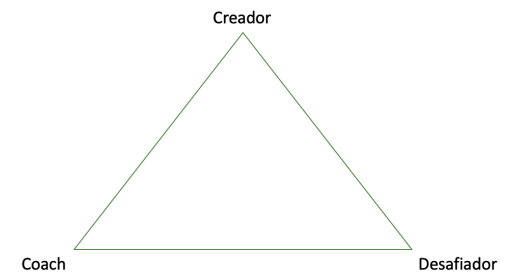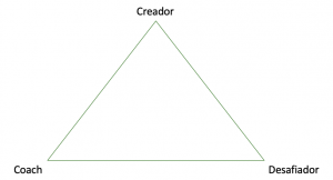 Este triángulo es el triángulo del liderazgo, un triángulo en el que: él que se expresa es el Creador y hay dos roles que acompañan al creador a impulsar su liderazgo. El rol de Coach que sostiene y reconoce quién es el creador y le acompaña. El Desafiador que desafía al creador a crear algo más grande.